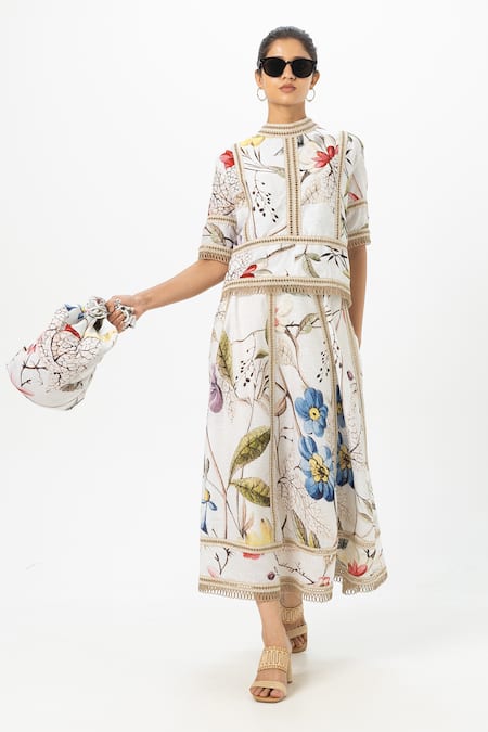 Off White Linen Embroidery Round Neck Floral Alicia Skirt Set