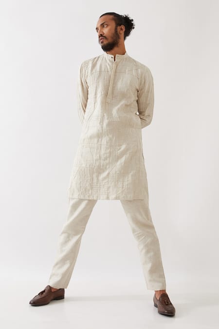 Ivory Linen Embroidery Ethan Geometric Pintucked Kurta With Trouser