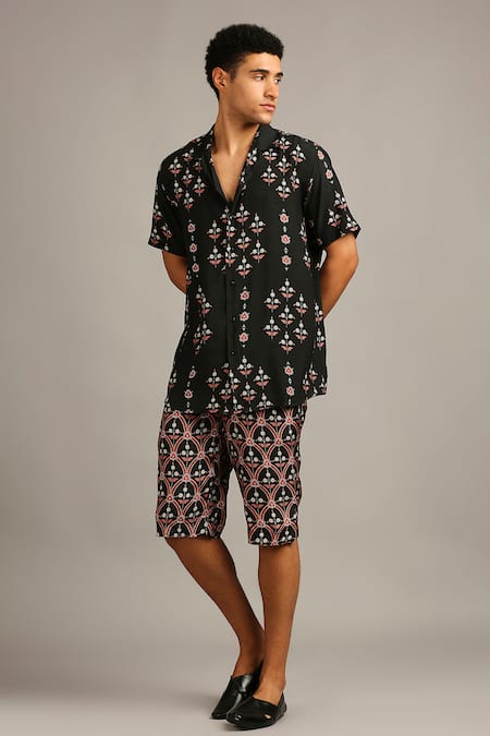Black Twill, Muslin Slub Floral Print Shorts Set