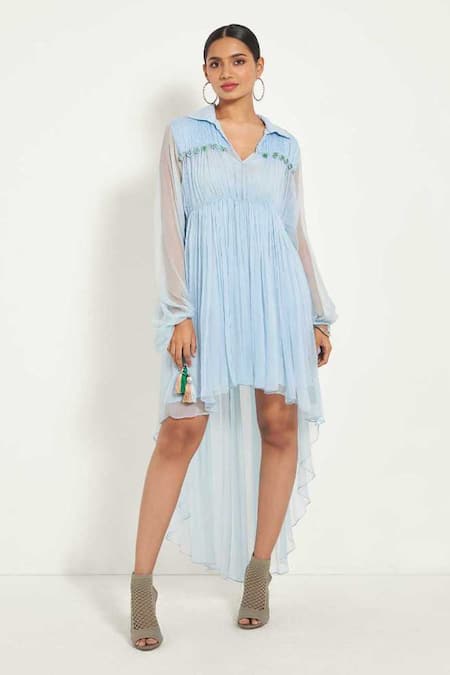 Blue Chiffon Tassels Shawl Neck Layered Dress