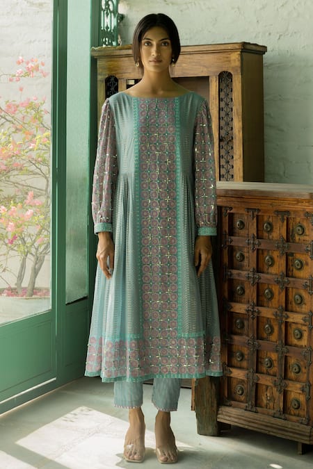 Blue Georgette Boat Printed Anarkali And Pant Set