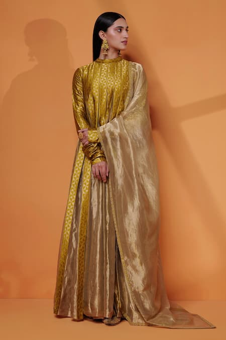 Green Silk, Tissue Embroidery Mandarin Handwoven Panelled Anarkali With Dupatta