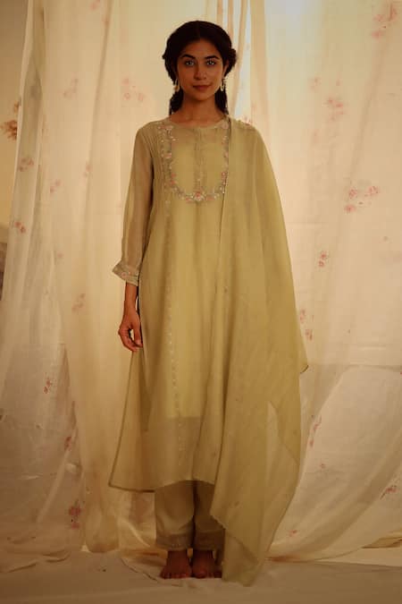 Green Handloom Cotton, Viscose, Silk Camelia Flower Yoke Kurta And Pant Set