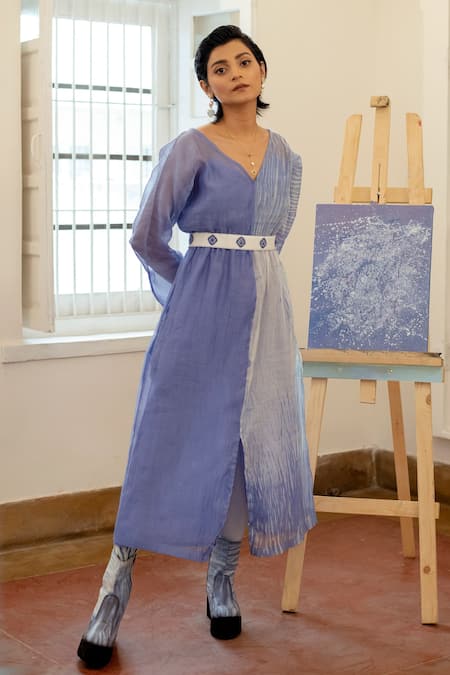 Blue Chanderi Organza Silk V Neck Handwoven Shibori Dress