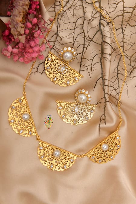 Gold Plated Pearls, Zari Nilofer Carved Pendant Necklace Set