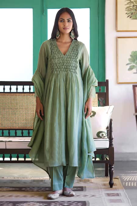 Green Silk, Chanderi, Cotton Embroidery Hand Kurta Set