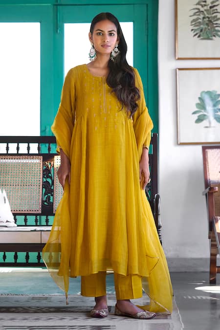 Yellow Silk, Chanderi, Cotton, Organza Embroidery Kurta Set