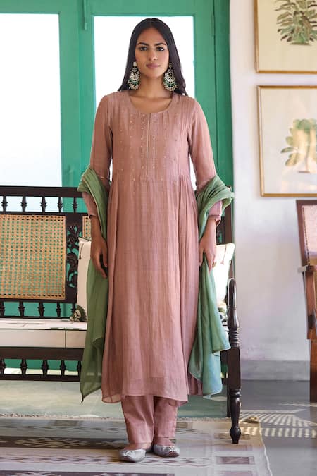 Pink Silk, Chanderi, Cotton Embroidery Kurta Pant Set