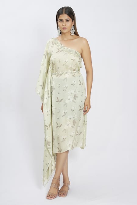 Green Satin, Viscose Floral, Mirror Asymmetric One Shoulder Printed Kaftan