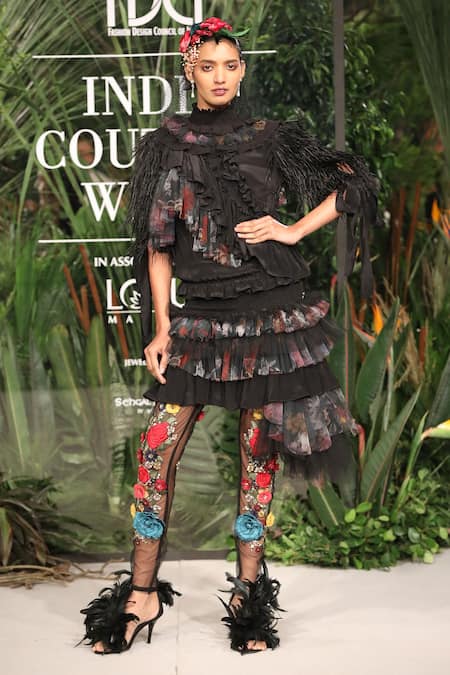 Black Tulle, Viscose Crepe Corsage High Neck Printed Ruffle Dress