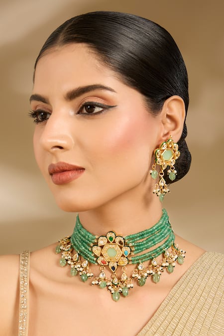 Green Beads, Pearls, Stones Gold And Beaded Choker Set