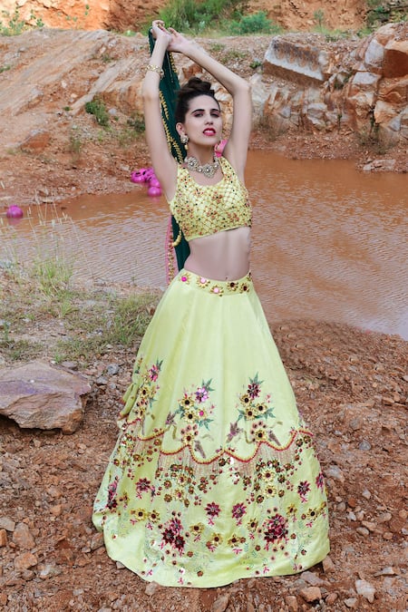 Yellow Raw Silk, Georgette V Neck Embroidered Lehenga Set