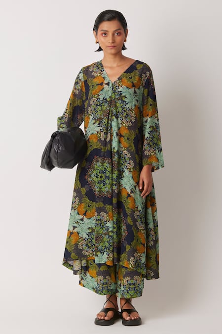 Brown Modal V-neck Accord Chaotic Wood Print Dress
