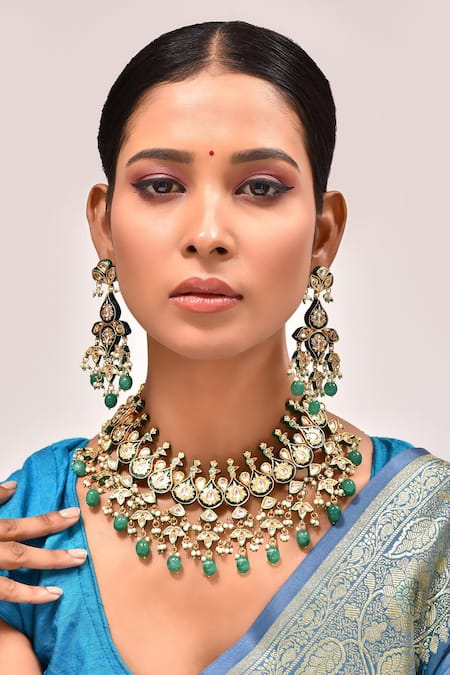Gold Plated Stones, Pearls Mughal Pattern Kundan Embellished Necklace Set